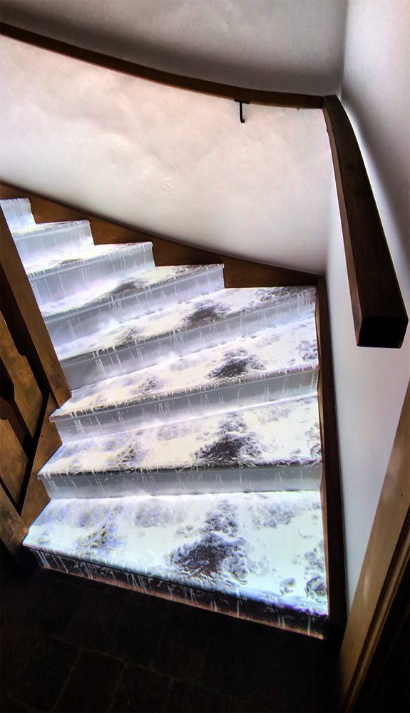 Les glaces ne sont plus éternelles. Celles des glaciers de montagnes partout dans le monde disparaissent à vue d’œil tout comme celles des banquises. D’un côté les scientifiques s’alarment de la fonte des glaces et avertissent des conséquences néfastes à venir très rapidement, de l’autre les gouvernements et les entreprises ouvrent de nouvelles voies d’exploitations, de nouvelles routes commerciales à travers les banquises, et le pôle Nord fait de nouveau l’objet d’enjeux géostratégiques à hautes tensions. Alors que l’on voit un monde disparaitre, la fonte des glaces n’est pas sans effet délétère sur les écosystèmes, on s’empresse déjà d’en conquérir les ruines… On sait aussi le rôle prépondérant que jouent les banquises sur les équilibres climatiques, notamment sur la circulation océanique. La diminution de ses vastes langues glacées amènera indéniablement son lot de catastrophe qui viendront s’ajouter à celles en cours.. Tout se passe comme si nos sociétés, lancées dans une course effrénée aux profits et à l’abondance pour quelques uns et à l’exploitation et à la servitude pour une grande majorité, avaient, probablement inconsciemment, décidées de leurs fins, de leurs effacements, de leurs disparitions. Ainsi les fondations sur lesquelles elles reposent semblent se désagréger. Elles fondent comme neige au soleil. Je pense aussi au roman de science fiction de Isaac Asimov : FONDATION. Je ne peux m’empêcher d’espérer qu’une science, comme celle de la psychohistoire, qui prédisait dans l’œuvre la chute de l’Empire au 25 millions de mondes habités, et qui pouvait réduire par ses prédictions la longue période de barbarie qui immanquablement suivrait, évaluée à 30 000 ans à seulement 1000 ans, en regroupant toutes les connaissances et les savoir de l’humanité, puisse nous sortir de l’impasse dans laquelle nous nous enfermons. C’est là un rêve d’enfant, il va sans dire. Je m’amuse ici à confronter ses rêveries à la dureté d’une réalité où les représentations du désastre en cours en seraient publicitaires, comme si l’on essayait de nous vendre en même temps un monde rêvé et sa fin brutale. J’imagine le contexte de cette œuvre comme si elle était installée dans une grotte, ou une caverne. Comme si elle se référait à la mise en scène de l’allégorie de la caverne de Platon. Comment fonder une réflexion épistémologique sur les origines de la connaissance et comment en tirer le meilleur parti – celui d’une humanité dégagée de son Hybris.