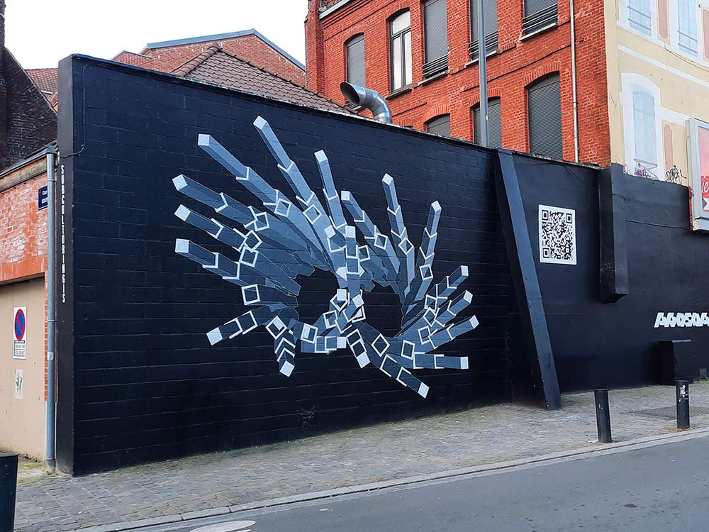Peinture augmentée. Panneau CP, découpe CNC, acrylique + application R.A. Dans cette application murale j’évoque les doubles rotations, le tore de Cliford et autres variétés.